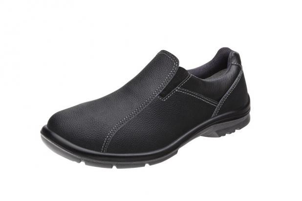 Tênis ocupacional confeccionado em couro, biqueira True Line, colarinho soft acolchoado, fechamento em elástico, palmilha de montagem em poliéster resinado, solado ergonômico em PU bidensidade com sistema de absorção de impacto, injetado diretamente no cabedal.